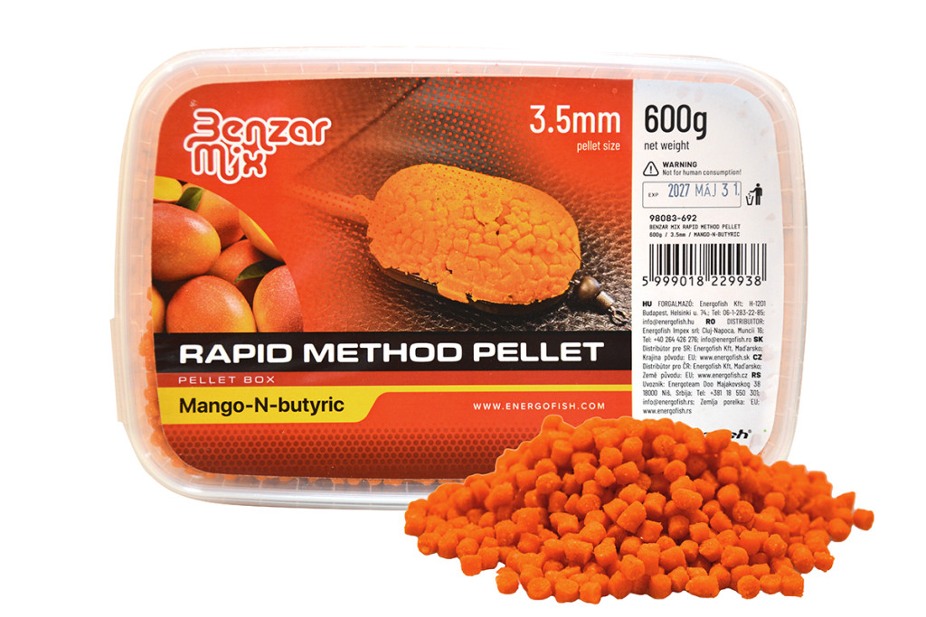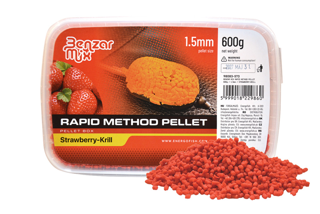 A Rapid Method Pelletek gabonabázisú granulátumok, tehát hallisztet nem tartalmaznak. Összetevőik között a pontyok tradicionális kedvencei kaptak elsősorban helyet, mint a kukorica. Nagyon szép, élénk színekben és két méretben, 1,5 és 3,5 mm-es kivitelben kerülnek a dobozba ezek a termékek.