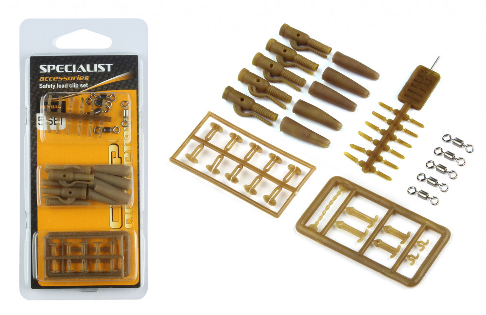 A készlet tartalmaz biztonsági ólomkapcsokat, a furatokhoz illeszkedő biztosítóelemeket. Forgókapcsokat az előkéhez, továbbá öt különböző méretű és típusú stoppert a csalikhoz.