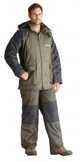 Kedvező árú kétrészes thermoruha (kabát és kantáros nadrág), melegen bélelt 100%-ig vízálló 190T poliamidból.