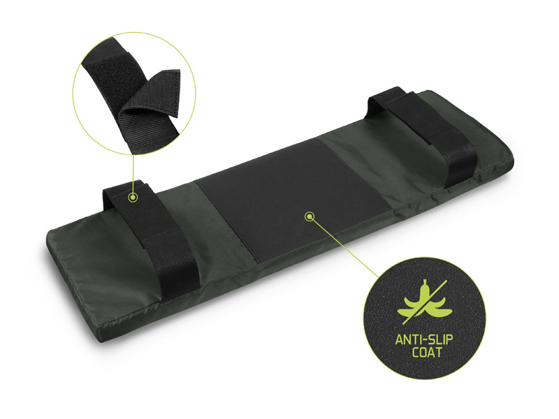 Az alsó oldalon csúszásmentes gumi felület található, amely tökéletes tapadást biztosít a pad felületéhez. A két tépőzáras pánt lehetővé teszi a gyors rögzítést bármely szabványos csónakpadra.
