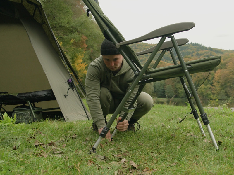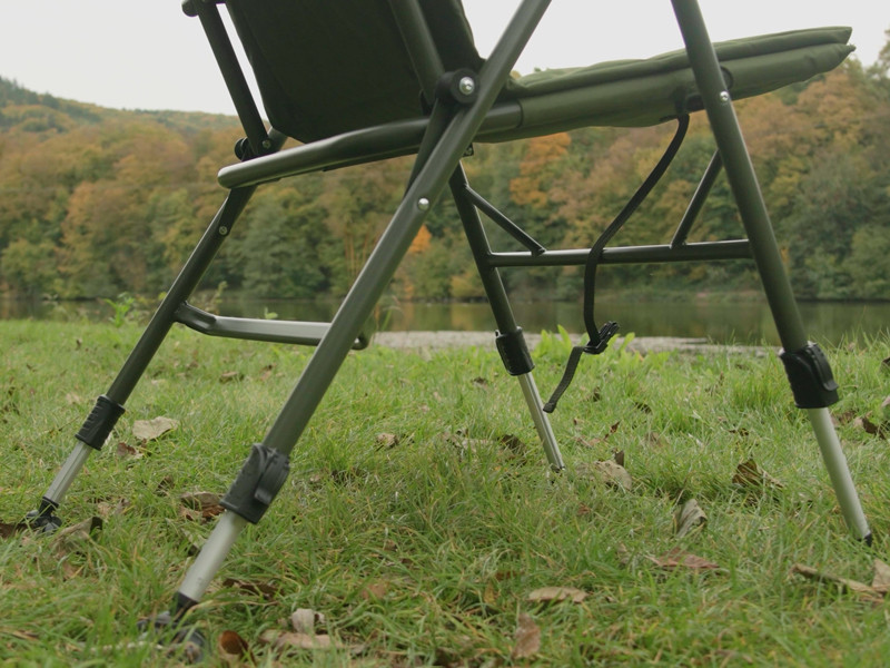 A teleszkóposan állítható lábaknak köszönhetõen a szék könnyedén alkalmazkodik az egyenetlen terephez, és stabilan áll még nehezebb körülmények között is. A rugalmas, nagy felületû, masszív tappancsok megakadályozzák, hogy a lábak belesüllyedjenek a puha talajba a vízparton. Emellett a szék egy mûanyag rögzítõcsipesszel is el van látva, amely szállítás közben biztonságosan összetartja, így véletlenül sem nyílik ki.