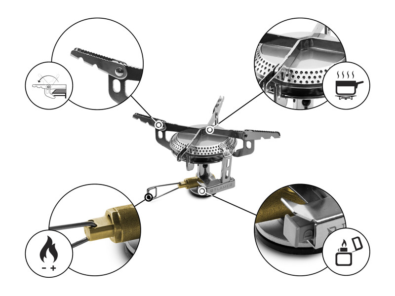A tűzhely kompatibilis a propán-bután gázpalackokkal, amelyek 7/16-os menetes önzáró szeleppel vannak felszerelve. A lehető legjobb kezelhetőség érdekében a FLAMER praktikus gázáramlás-szabályozással és piezoelektromos gyújtással van felszerelve. Ennek köszönhetően nem lesz többé szüksége gyufára vagy öngyújtóra.