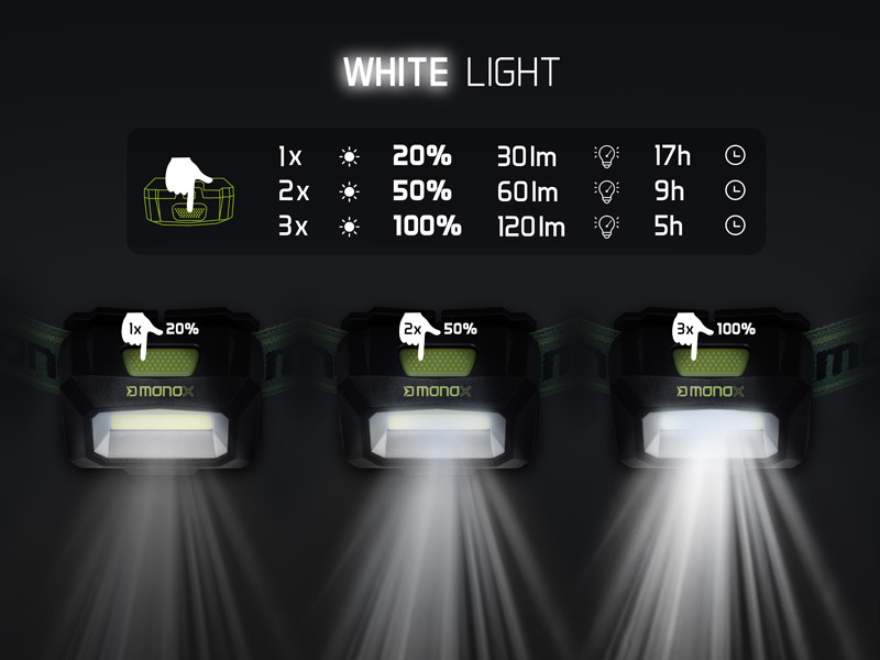 A fehér fény három világítási móddal rendelkezik. Az elsõ gombnyomás 20%-os intenzitáson kapcsolja be a lámpát, akár 17 órás üzemidõvel. A második nyomás az 50%-os módot aktiválja, amely 60 lumen fényerõt biztosít, és 9 órán át mûködik. A harmadik nyomás a legerõsebb, 100%-os módra vált, amely 5 órán át világít. A gomb hosszabb nyomva tartásával a zöld fényt kapcsolhatjuk be, amely kétféle módban használható. Az elsõ módban 100%-os intenzitással világít 12 órán át, míg a második módban – egy újabb gombnyomással – az intenzitás 50%-ra csökken, így az üzemidõ akár 40 órára is meghosszabbítható. A zöld fény egyik nagy elõnye, hogy nem vonzza a kellemetlen rovarokat, ami különösen hasznos a forró nyári estéken.