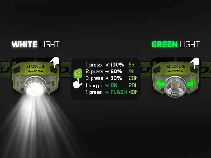 5 W-os teljesítményével és 300 lm-es fényerejével közelre vagy távolra fókuszálhatja a lámpa fénysugarát. Az OXUS ZOOM mozgásérzékelõvel rendelkezik, melynek köszönhetõen egy kézmozdulattal könnyedén be- vagy kikapcsolhatja.