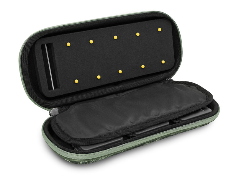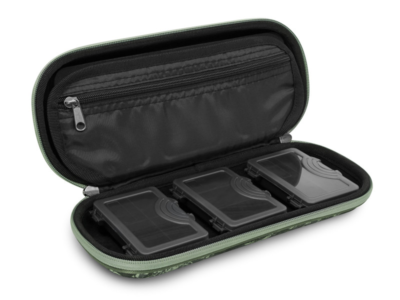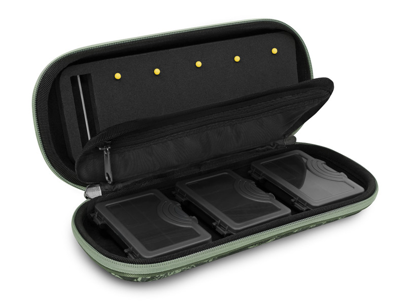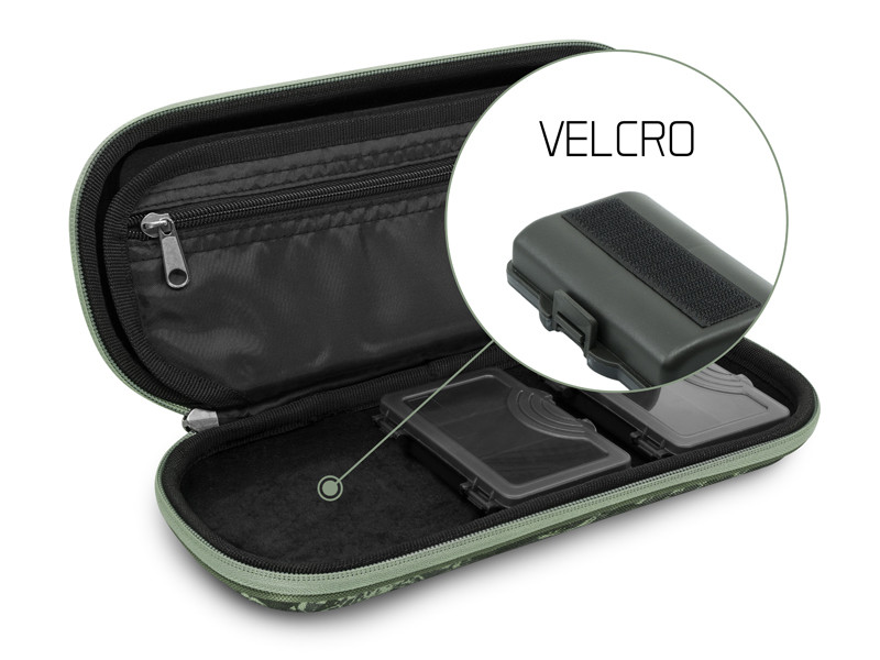 Belül a tok három részre oszlik: a bal oldali habszivacsból készült (26x10x1 cm) és 10 sárga tűvel rendelkezik az előkék tárolására, a jobb oldalon három különálló doboz található a pontyos tartozékok számára (10x7x2,5 cm), ill. a harmadik egy elválasztó rész középen, aminek cipzáras zsebe van. Itt ollót vagy egyéb apró tárgyakat tárolhat. Ez a csúcsmodell egy igazán jó üzlet!