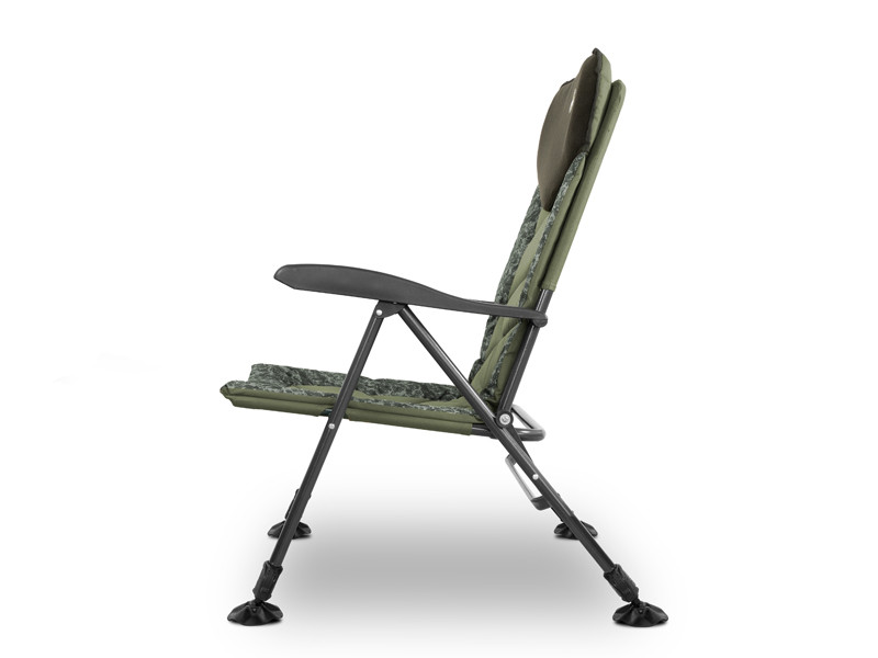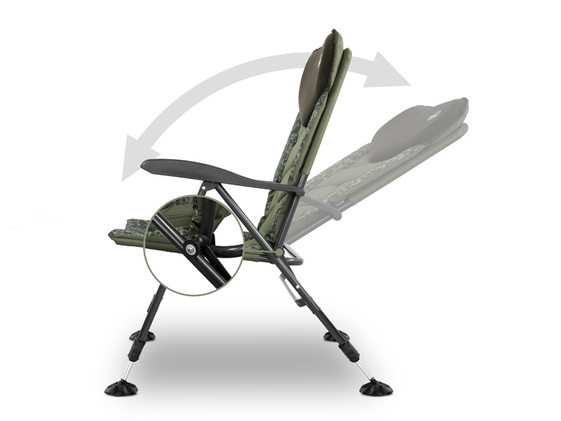 A szék karjaiban elhelyezett állítható mechanizmus lehetővé teszi a háttámla dőlésszögének változtatását a horgász igényei szerint. A fej és a nyak maximális kényelmét a sötétzöld színű extrán párnázott polár fejtámla biztosítja, amelyen a termék logója látható. A háttámlában és az ülőrészben található matrac tartós 600D anyagból készült, egyedi átlós varrással. A széleit 600D szövet borítja, szabadalmaztatott C2G terepszínben. A halfogások közötti kellemes időtöltés érdekében a szék ergonomikusan kialakított karfákkal van felszerelve, amelyek tökéletes kényelmet nyújtanak pihenés és a természetben való gyönyörködés közben.