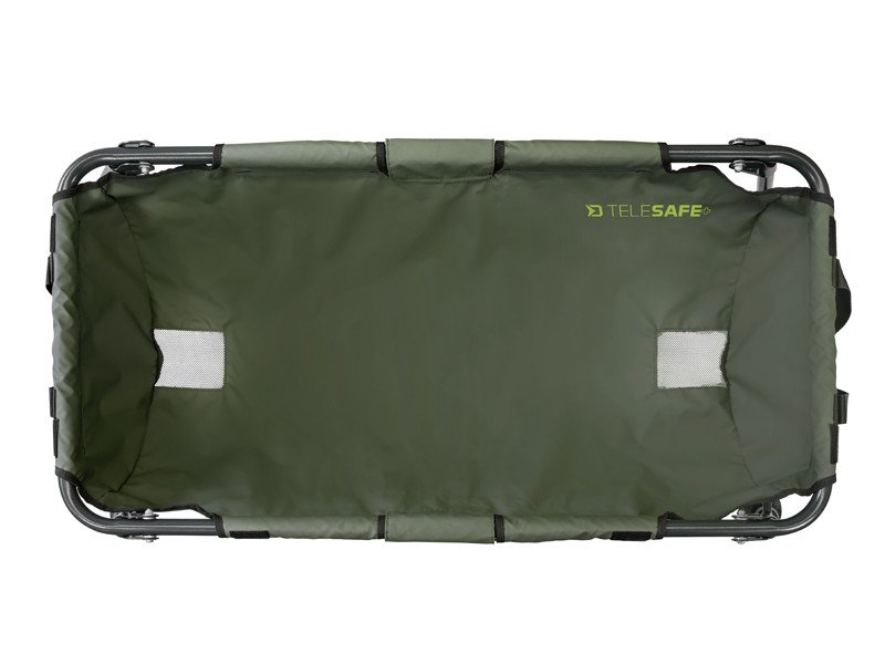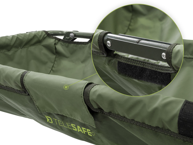 A TeleSAFE+ pontybölcső alapját 22mm átmérőjű acél szerkezet alkotja. Ennek köszönhetően nagyon jó a stabilitása, nem dől fel, nem sérül a fogással való manipulálásnál. A használt gumírozott anyagnak több előnye van. Horgászat végén elég kitörülni és nem kell várni, hogy megszáradjon. Ráadásul könnyen mosható és nem szívja magába a kellemetlen szagokat, melyek szállításkor az autójában terjengenek. A pontybölcső nagyon erős és az extrém tesztek során sikerült megtartania 75kg statikus súlyt. Mindkét végén hálós anyag van belevarrva, merre a víz ki tud futni. A TeleSAFE+ rendelkezik takaró anyaggal, melyen tépőzár van. Ennek köszönhetően a fogását le tudja takarni míg előkészíti fényképezőgépét, vagy vízzé megyen, hogy le tudja locsolni. A teleszkópos lábak csuklós tappancsokkal vannak ellátva, így jól illeszkednek a terephez, nem süppednek bele ha puhább a talaj. A tervezésnél gondoltunk a szállításra is, mely szintén erős része ennek a terméknek. A közepén a szerkezet el van felezve, így elég ketté hajtania és a fogantyú segítségével könnyedén hordani.