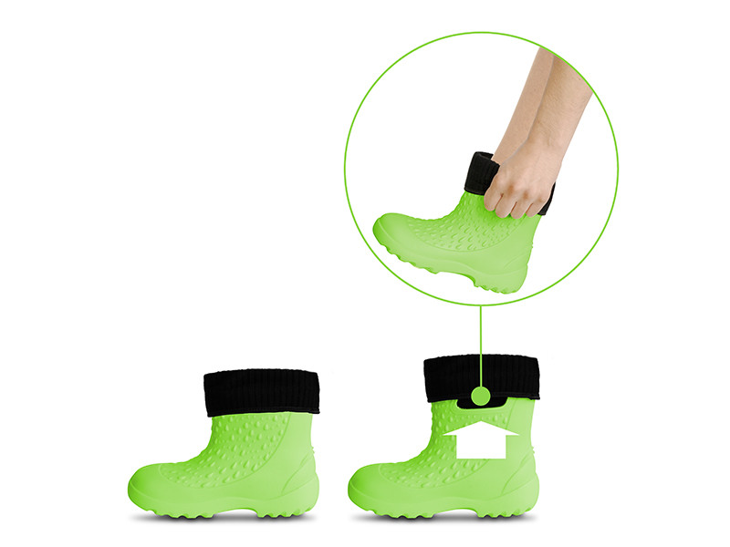 Meleg bélése eltávolítható, így a csizma minden évszakban használható. EVA habból készül a puhaság és rugalmasság érdekében. A felső részen bevágások találhatók, hogy kényelmesebben felvehető legyen. A talp kiváló tapadású, amely csökkenti a nedves vagy egyenetlen terepen való elesés esélyét. Ezek a csizmák semleges zöld színben és sok méretben kaphatók, így fiúknak és lányoknak egyaránt ajánljuk.