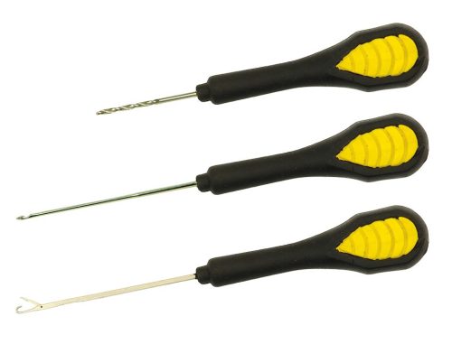 A készlet tartalmaz egy csalifúrót kemény magok, bojlik lyukasztásához. Egy kapcsos fűzőtűt a puha, vagy előfúrt csalikhoz, szerelékekhez. Valamint egy kapocs nélküli fűzőtűt, amellyel bojlikat, pelleteket, főtt magokat fűzhetünk fel a hajszálelőkére.