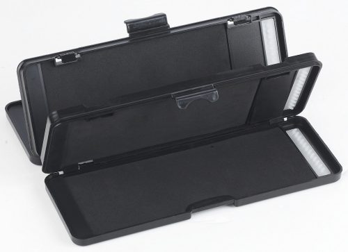Keményfedelű, nyitható előketartó doboz.