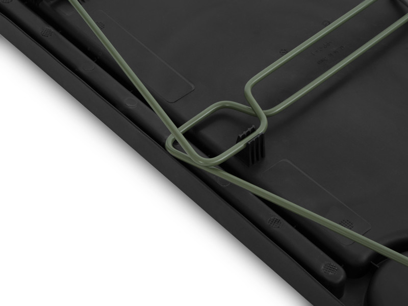 Az asztal lábai összecsukhatók, így szállításhoz rendkívül kompakt méretűre hajtható össze. Az asztallap alján található praktikus rögzítőkapcsok stabilan tartják a lábakat mind nyitott, mind zárt állapotban, így megakadályozzák azok nem kívánt elmozdulását használat vagy szállítás közben.