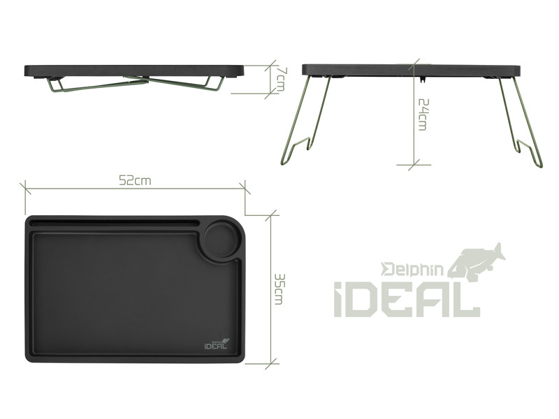 Ahogy a neve is sugallja, a Delphin iDEAL asztal tökéletes társa lesz pontyhorgásztúráin. Ez az összecsukható asztal mindent biztosít, amire szüksége lehet – akár a felszerelés rendszerezéséhez a sátorban, akár az elõkék elkészítéséhez. Az asztallap strapabíró mûanyagból készül, és minden oldalán megemelt perem található, hogy megakadályozza az apró tárgyak leesését.