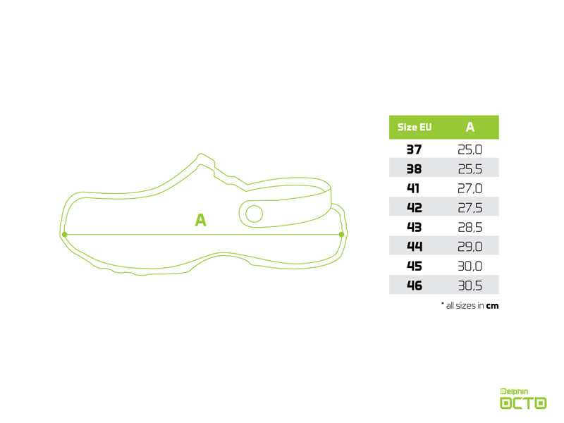 Egy másik kifinomult elem a nagy méretű oldalnyílások, amelyek elsődleges feladata a szellőzés. Szándékosan nem a talp magasságában vannak kialakítva, mint az szokásos, hanem valamivel magasabban. Ez a részlet fontos szerepet játszik a parton vagy sekély vízben való tartózkodás során. Azáltal, hogy a furatok valamivel magasabbak a talpbetét felett, a homok vagy a kövek nem kerülnek be egyszerűen a papucs és a talp közé. Tehát a lábad a lehető legnagyobb mértékben védett. Ezen nyílások mellett a felső részen elhelyezett sűrű perforáció is a szellőzésre szolgál. Az egyik oldalon szándékosan a Delphin logóból származó D szimbólum alkotja, a másik papučon pedig az O szimbólum az OCTO név kezdőbetűjeként uralkodik. Az összbenyomást tovább növeli a talp felszínén található finom szerkezet, amely a tintahal bőrét idézi. A felhasznált EVA anyagnak köszönhetően rendkívül könnyűek, szívósak és lebegnek. Természetesen tartozéka a modellnek a sarokpánt a láb rögzítésére, amelyet különösen egyenetlen vagy lejtős terepen fog értékelni.