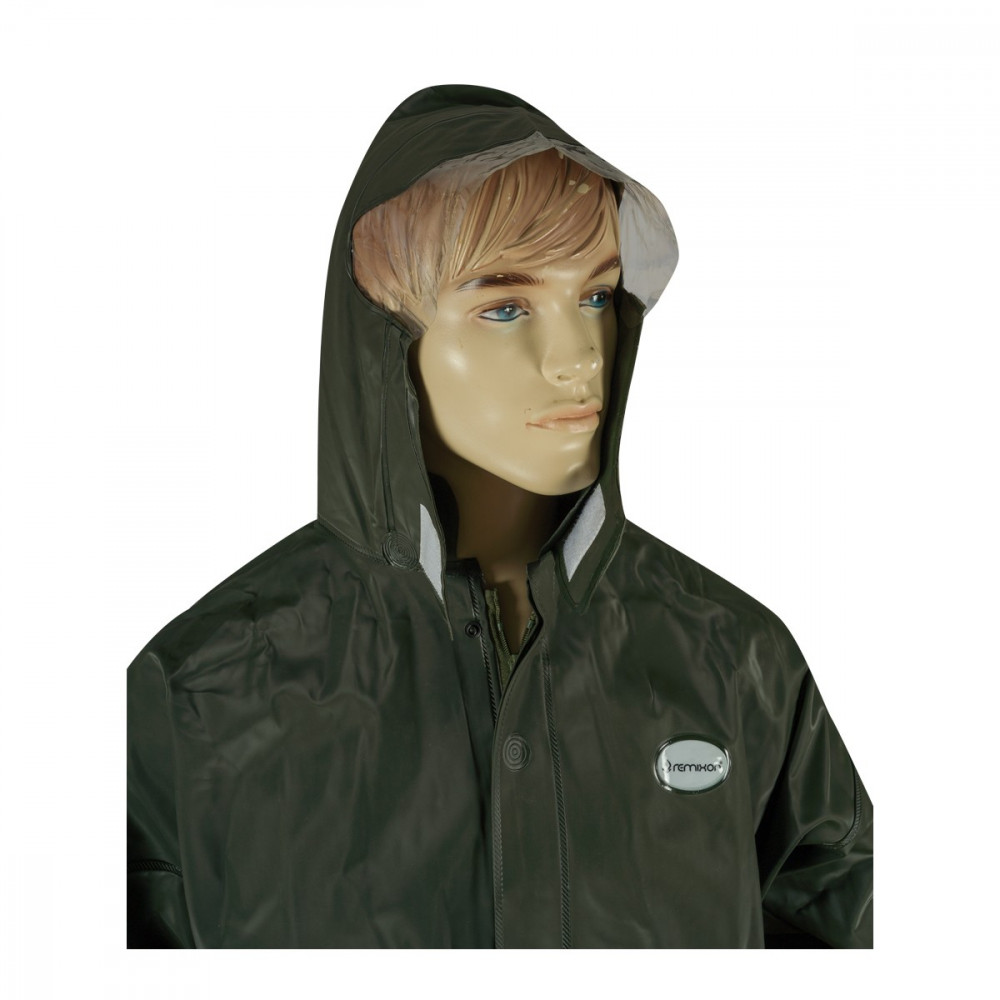 Remixon PVC esőruha szett A különböző időjárási viszonyokhoz tökéletesen alkalmas Remixon esőruha szett kis helyen elfér és minden horgász számára alap kiegészítőként szolgál.. A termék egy ellenálló PVC anyagból készült kétrészes (nadrág + kabát) esőruha, mely 100%-osan megakadályozza, hogy az eső tönkre tegye a horgásznapot! A kapucni elülső fele extra kialakítást kapott, mely könnyű látási viszonyokat biztosít. A kabátot lévő külső felületek és varrások tökéletesen hegesztettek és a praktikus kialakításnak köszönhetően elrejthetőek, így kizárt annak a lehetősége, hogy nedvesség jusson a ruha alá. Plusz 2 nagy méretű zseb is került a kabát elülső részére.