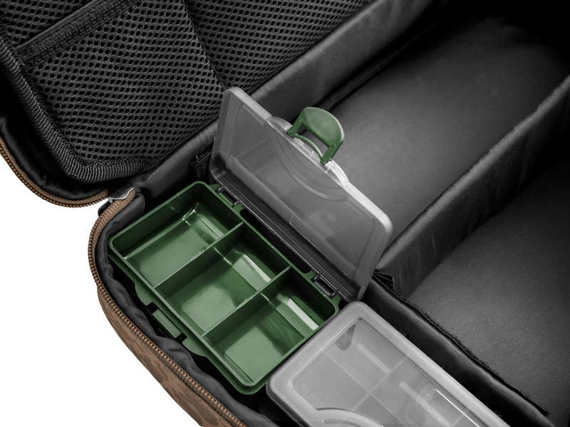 A fõ rekesz bõséges helyet biztosít az aprócikkeknek, elõkezsinóroknak és a szükséges eszközöknek melyekkel elkészíti szerelékét. Ráadásul négy doboz is található melyben az aprócikke elfér. A középsõ rész egyik oldalán kisebb hálós zsebek vannak, míg a másikon nagy hálós zseb található. Ennek köszönhetõen mindig jól lássa mi hol van, így könnyen hozzáfér. A RigStation rendelkezik két hab fallal, melyre az elõkötött horgait tudja rögzíteni. A hordó fül a táska felsõ részén van, így hordáskor nem fordítsa fel, felszerelése mindig a helyén van. Minõségi cipzárral és mûanyag húzóval van ellátva. A RigStation a halmintás CARPATH sorozatot bõvíti.