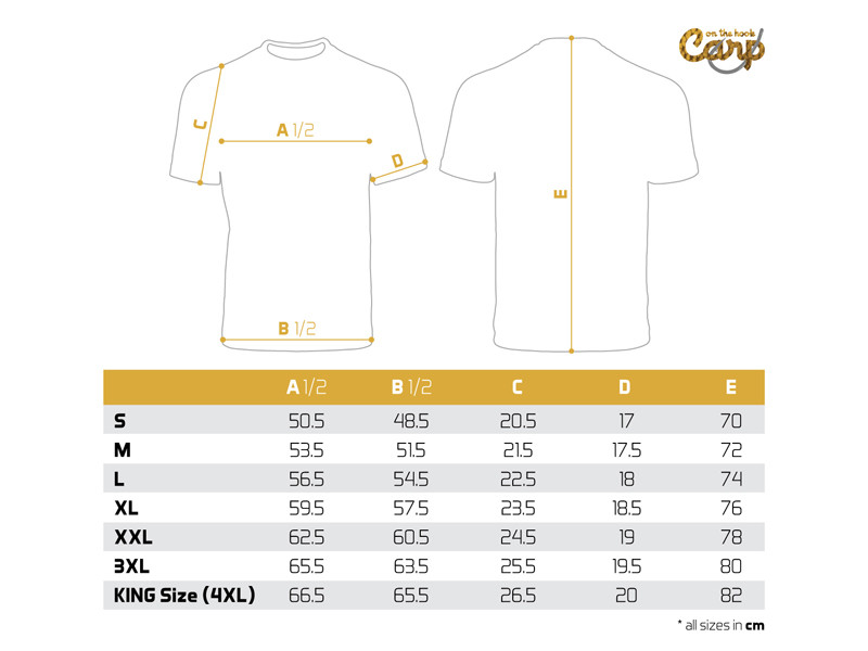 Maga a póló kiváló minőségű, akárcsak a rajta lévő színes nyomat. Széles méretválasztékban kínáljuk az S-től a KING SIZE-ig (4+XL-nek felel meg, amit a legtöbb országban XXXXXL-nek neveznek). A King size méretű modell még a legnagyobb horgászok számára is megfelelő, akik akár 135 kg-nál is nehezebbek.
