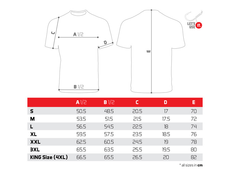 Maga a póló kiváló minőségű, akárcsak a rajta lévő színes nyomat. Széles méretválasztékban kínáljuk az S-től a KING SIZE-ig (4+XL-nek felel meg, amit a legtöbb országban XXXXXL-nek neveznek). A King size méretű modell még a legnagyobb horgászok számára is megfelelő, akik akár 135 kg-nál is nehezebbek.