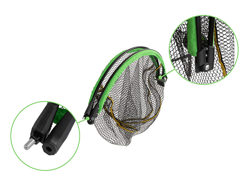 Mivel a fej a lebeg a vízfelszínen, nyugodtan ott lehet hagyni, amíg a halat fárasztja, és a merítőháló felé tereli. Kialakítása illeszkedik a REAXE feeder sorozatunk zöld és fekete színéhez. A keret félbehajtható, így nem foglal annyi helyet, mint a hagyományos merítőhálófejek.