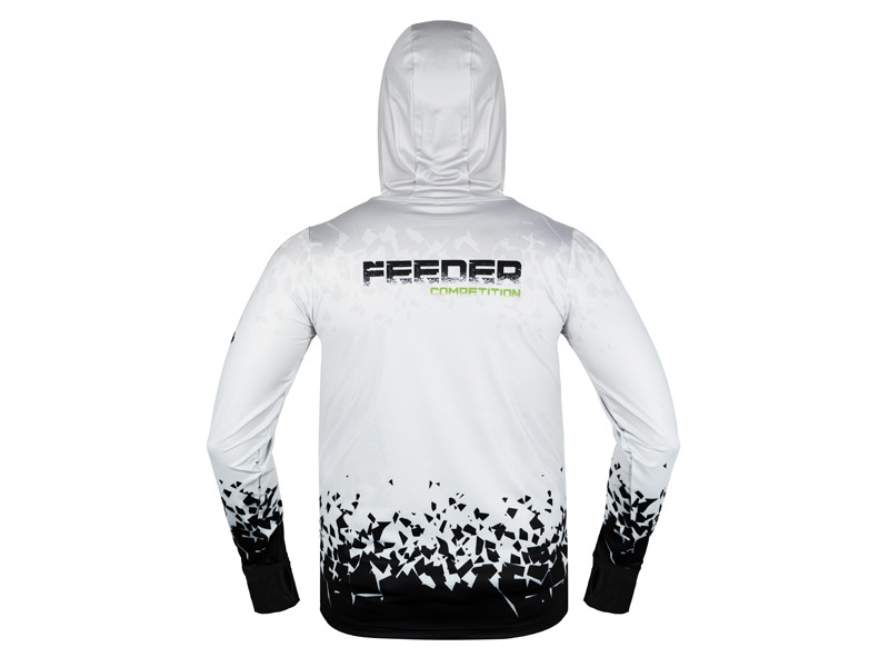 Tervezésekor figyelembe vettük azt is, hogy a melegnek leginkább kitett testrészünk a fejünk. Ez a póló jelentősen megemelt gallérral és kapucnival rendelkezik, valamint hüvelykujjlyukakkal ellátott meghosszabbított ujjakkal, ezzel fokozva kézfejünk védelmét. A kényelmes, rugalmas anyag nagy előnye, hogy gyorsan szárad, ha horgászat közben elázna.