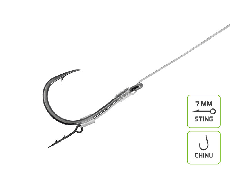 A szerelék kiváló minőségű fluorokarbon zsinórból készül, amely a víz alatt szinte láthatatlan a halak számára. Az alacsony észlelhetőség mellett nagy kopásállósággal is rendelkezik, így megbízható választás akadók közelében vagy kemény aljzaton történő horgászat során. A biztos akadást a bevált Turner és Chinu horogmodellek garantálják. Speciális kialakításuk és kivételes élességük biztonságos fárasztást garantál, miközben minimálisra csökkenti a halvesztés kockázatát.