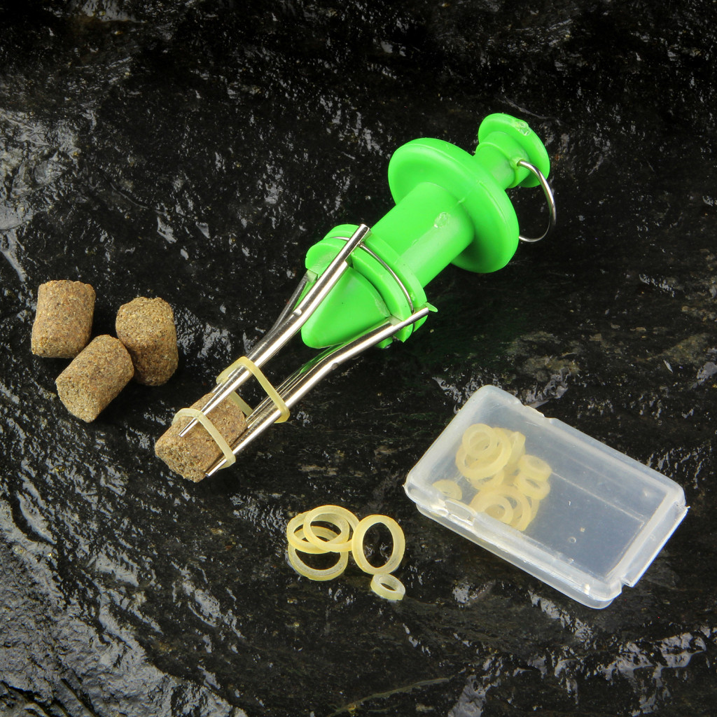 Egyszerű eszköz pelletek és egyéb csalik szilikongyűrűvel való felszereléséhez.
