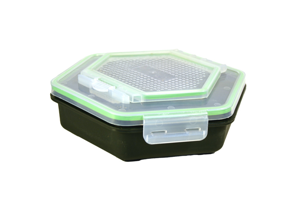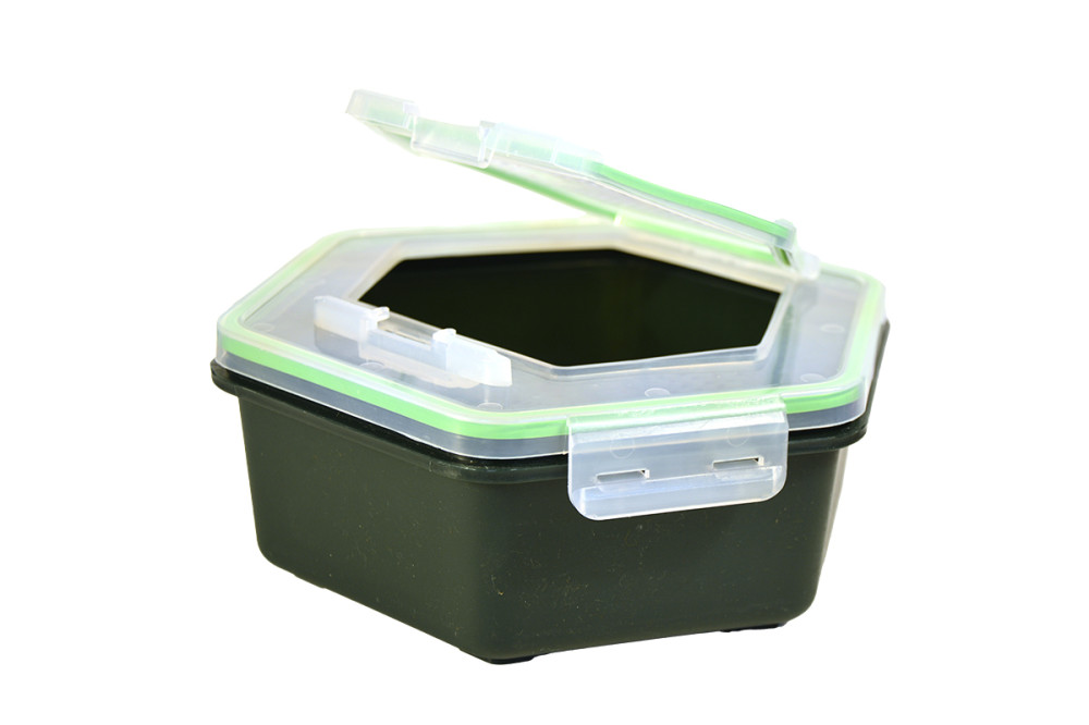 Masszív műanyag csalitároló doboz precízen záródó műanyag fedővel. Apró furatokkal ellátott fedele engedi levegőzni a csalinkat. Kis méretű furatain még a legkisebb pinkik sem tudnak megszökni. A dobozok fedele praktikus felső és oldalsó patentzárakkal van ellátva, mely miatt a praktikussága, akár csalizás során is kiemelkedő.