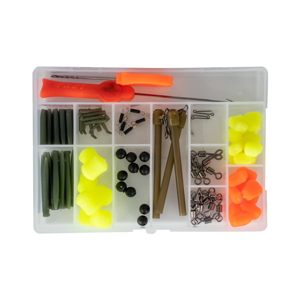Carp Expert Rapid All-In Feeder kiegészítő szett dobozzal Nem csak egy kezdő horgász örülhet egy jól eltalált aprócikkes szettnek. Bárkinek nagy könnyebbséget jelent, ha összeállítják milyen kiegészítők szükségesek feltétlen egy rapid békéshalas horgászathoz. Ha ehhez még a megfelelő csalik is társulnak, akkor az már több a jónál. A Carp Expert Rapid All-in Feeder kiegészítő szett az alábbi összetevőkből áll: - 2 féle gumikukorica + 1 féle gumi pellet - Erős pontyozó forgók és gyorskapcsok - Többféle méretű praktikus gumikúp és gubancgátló - Gumigyöngyök - Finomszerelékes feeder gyorskapcsok - Csalitüskék - Csalifúró és fűzőtű Mindezen összeállítás egy jól záródo praktikus dobozban kapott helyet, mely kis helyen elfér és bármikor rendelkezésre áll a horgászdobozban vagy táskában, akár egy rapid feederes pontyozáshoz.