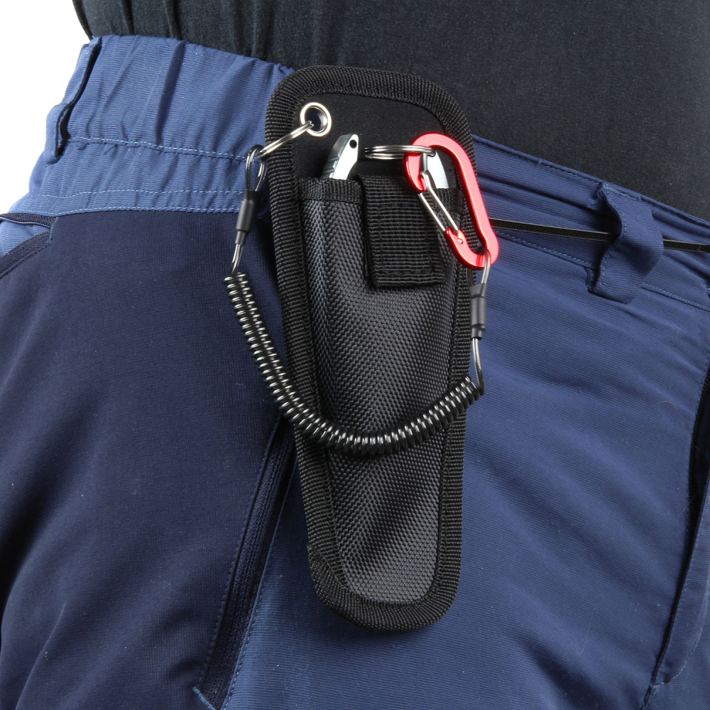 Övre fűzhető erős gyöngyvászon fogótartó. Biztonsági zsinórral és a fogót biztosító tépőzáras füllel.