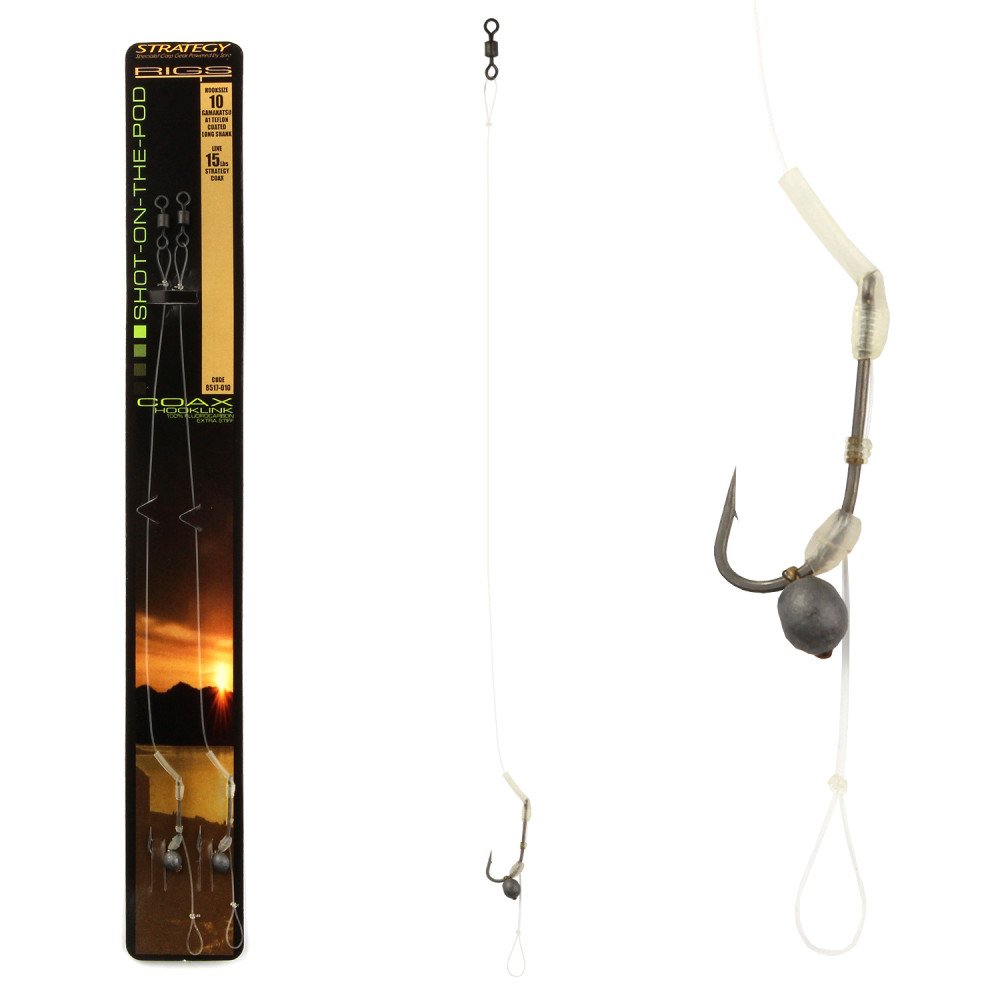 Speciális bojlis előke Shot On The Pod csalizáshoz. A fluorocarbon zsinór a víz alatt láthatlan. A horog öblére ólomsúly van elhelyezve, hogy a felkínált lebegőcsali csak a horogszárat emelje fel. Így a táplálkozó hal ideális szögben tudja felszippantani a csalinkat.