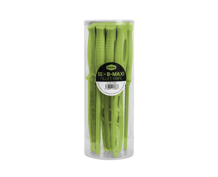 Egyszerû filézõ kés B-MAXI extra flexi pengével, melynek segítségével gyorsan kifilézi a halat vagy elkészíti a húst. A penge és a tok kirívó zöld színû, így nem veszik el a horgász kellékei között. Nagyszerûen megállja a helyét mûhelyében vagy kertjében is. Nagyon könnyû, biztonságos mûanyag tokkal kapható.