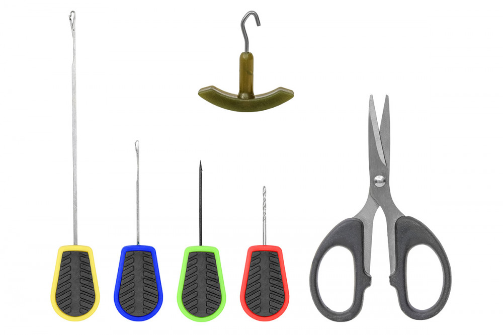 Praktikus, háromféle fűzőtűből, bojlifúróból, csomótesztelőből és egy ollóból álló szett. A fűzőtűk között biztonsági heggyel ellátott és anélküli is helyet kapott, melyekkel lágy és keményebb pelletek, PVA csomagok és bojlik is könnyedén felfűzhetőek. Az olló fonott és monofil zsinór vágásához is használható. Mind a bojlis, feeder és klasszikus fenekező horgászat során is hasznos kiegészítő, így érdemes mindig a táskában tartani.