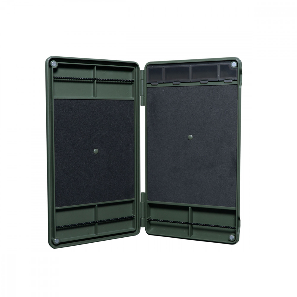 RidgeMonkey Armoury Rig Box előketárolóMivel a horogelőke a horgászfelszerelés egyik legfontosabb része, csak úgy van értelme, ha kellően biztonságosan tárolod őket. Az Armory Rig Box pontosan ezt teszi lehetővé. Bár könnyű és kompakt, az Armory Rig Box több mint 100 szerelék tárolására képes egyszerre, ami azt jelenti, hogy mindig mindenre készen áll.Egyszerűen csatlakoztassa a horgot a szereléktárolóhoz, és tartsa egyenesen a horogelőkéket úgy, hogy rögzítse a szerelék másik végét a mellékelt szerelékcsapokkal.Az Armory Rig Box négy tárolórekesszel rendelkezik, amelyek lehetővé teszik, hogy kéznél tartsa a szükséges tárgyakat, például horoggyöngyöket, fűzőtű vagy forgóelemeket. A fedél tetején vonalzó jelöléseket is talál, amelyek segítenek minden alkalommal tökéletes előkeméretet készíteni.Az Armory Rig Box robusztus ABS műanyagból készült, és időjárásálló, vagyis kibírja az idő próbáját, minden horgásznak tökéletes megoldást kínálva.Specifikációk:- Több, mint 100 szerelék tárolásához- Robusztus ABS és polipropilén konstrukció- Erős mágneses fedél- Két nagy előketábla- Négy tárolórekesz- Vonalzó jelölések a fedél tetején- A szerelékcsapok mellékelve